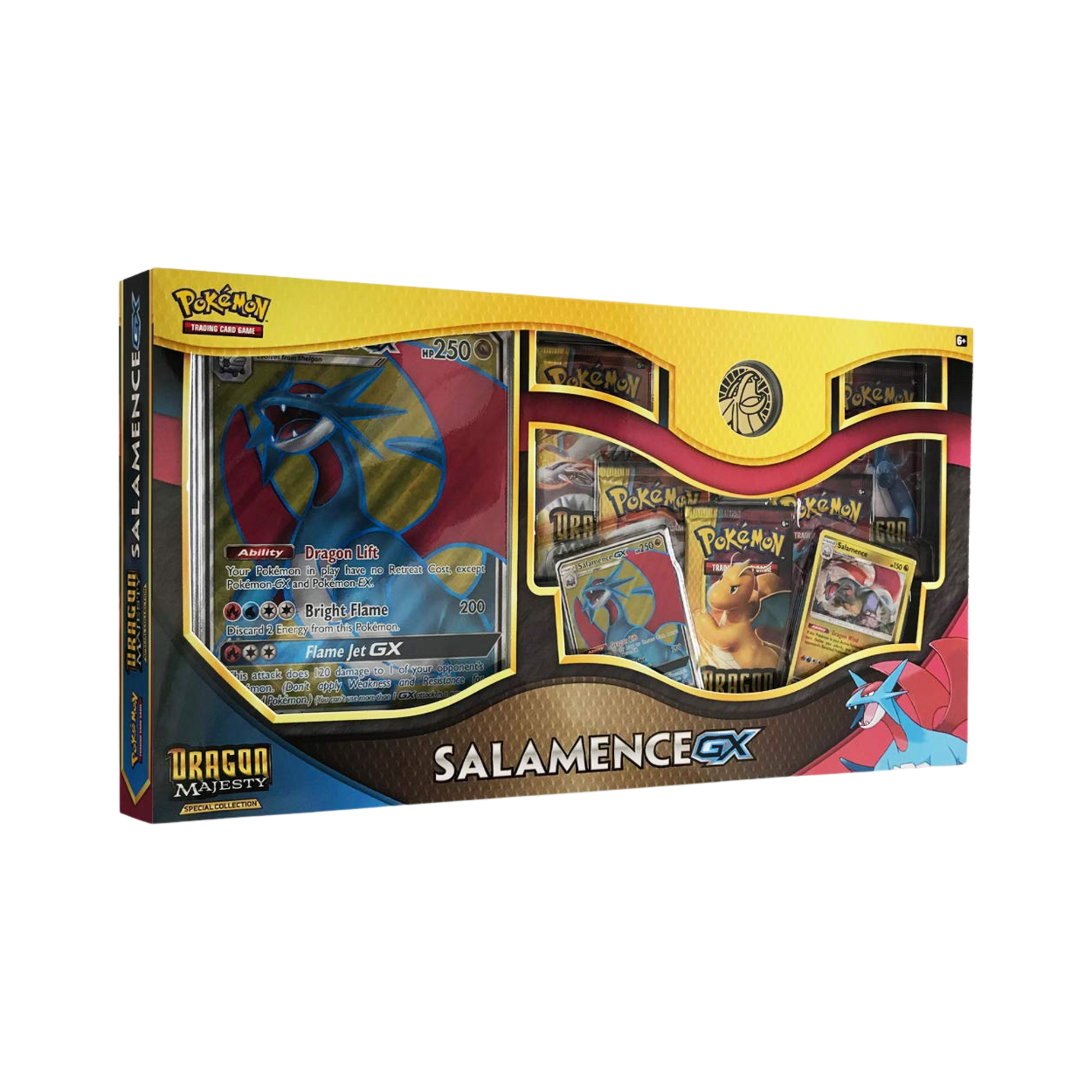 Command the skies with the Dragon Majesty Special Collection featuring Salamence-GX. This sealed box from the Sun & Moon: Dragon Majesty expansion is perfect for collectors and competitive players looking to add exclusive foil cards and booster packs to their collection.